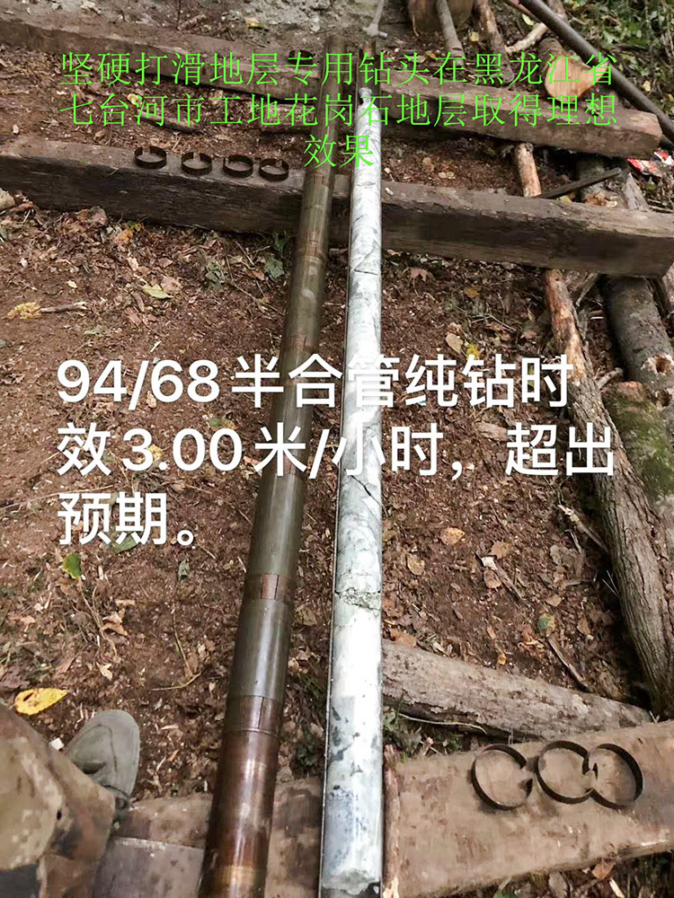 堅硬打滑地層專用鉆頭在黑龍江省七臺河市工地花崗石地層取得理想效果,94/68半合管純鉆時效3.00米/小時,超出預(yù)期。